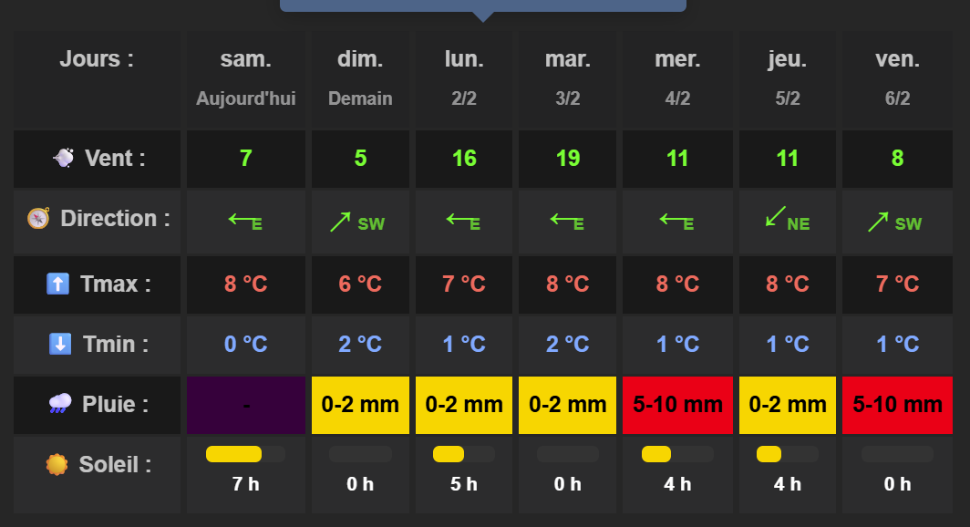 4px → plus serré6–8px → plus aéré8 messages ont été scindés en un nouveau sujet : PARTAGE prévisions nombres d’heures de soleil sur 7 jours en PHP