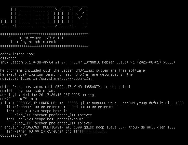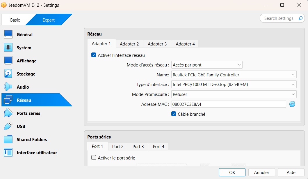 J’ai exporté ma VM de prod puis je l’ai importée dans Virtualbox mais ayant éteint la prod puis lancé Virtualbox je n’ai pas accès à mon Jeedom. Pb de config ? pas IP sur le réseau, voici quelques infos :