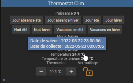 Même problème chez moi, je viens de réactiver le thermostat (je désactive durant l’été) et les valeurs de température ne se mettent pas à jour, malgré redésactivation / réactivation du thermostat (et tenté aussi avec désactivation / réactivation du plugin).