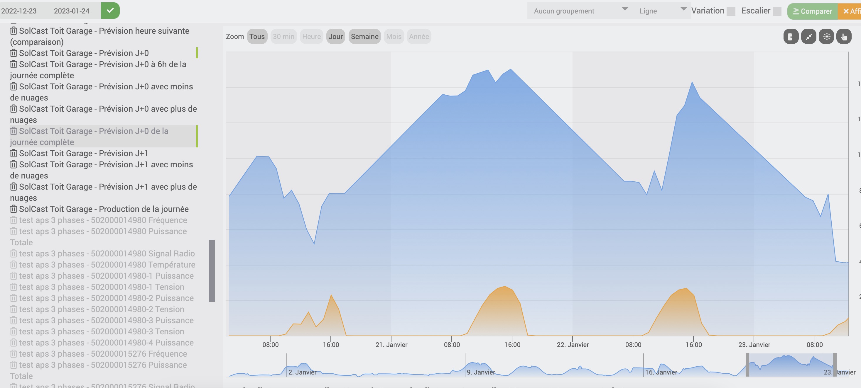Bon et bien on verra demain alors, il faudra me renvoyer les logs depuis environ 23h et surtout ceux de 05h45 où l’on voit la ligne : [2023-01-23 05:45:07][DEBUG] : Stockage des données de prévision de 6h pour tracer la courbe "Prévision à 6h"