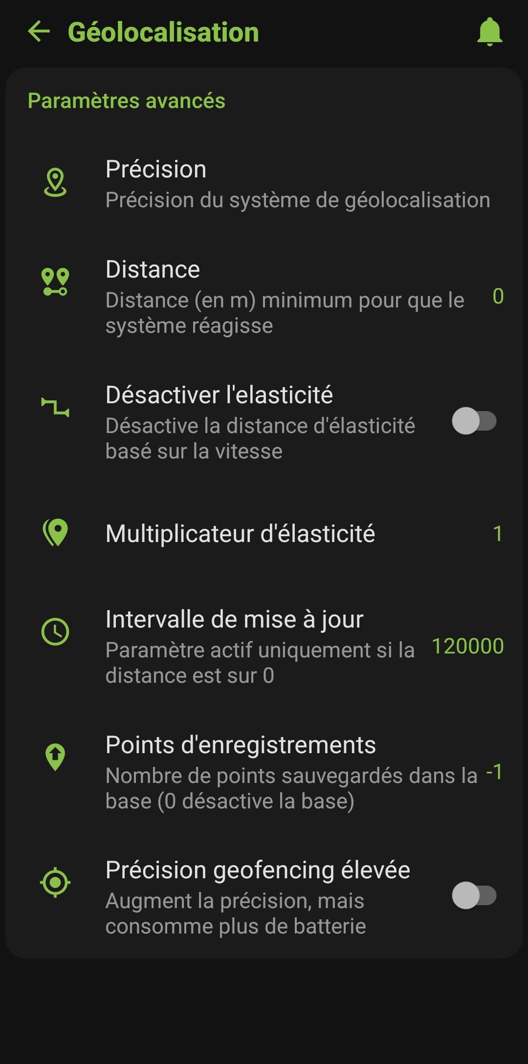 Je commence à mieux comprendre pourquoi je n’ai pas de remontée mais ce qui m’a induit en erreur c’est que quand on coche seulement le Géofencing cela dégrise la gestion des lieux (normal) et aussi les paramètres avancés (mon screenshot)