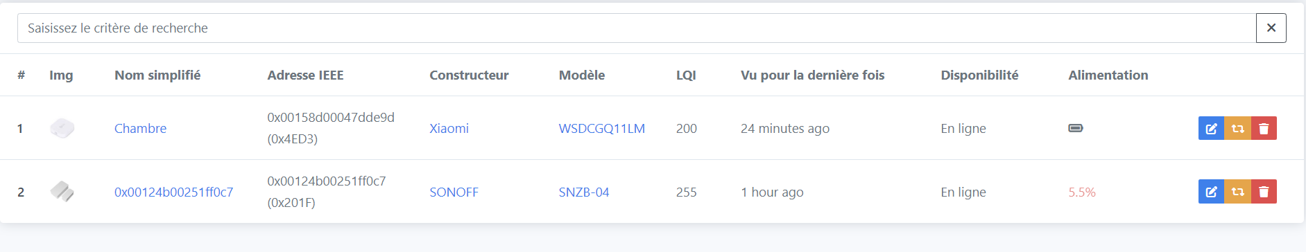 j’ai essayé avec un capteur de temp/hum Aquara et un capteur d’ouverture Sonoff ZNSB