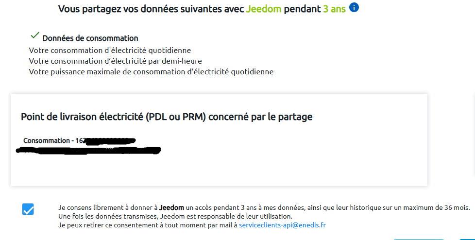 Meme probleme. Pourtant j’ai bien un mail d’Enedis indiquant que je partage durant 3 ans (démarrant il y a 2 jours) mes données avec Jeedom. Et sur leur site, pas de partage avec un tiers… Et dans jeedom : 0030|[2026-01-18 12:11:13]WARNING [Maison][Compteur] Erreur lors de la récupération des données horaires : Can no get enedis2 server 0031|[2026-01-18 12:11:13]WARNING [Maison][Compteur] Certaines données n'ont pas été récupérées : consumption_load_curve 0032|[2026-01-18 12:41:10]WARNING [Maison][Compteur] Erreur lors de la récupération des données horaires : Can no get enedis2 server 0033|[2026-01-18 12:41:10]WARNING [Maison][Compteur] Certaines données n'ont pas été récupérées : consumption_load_curve