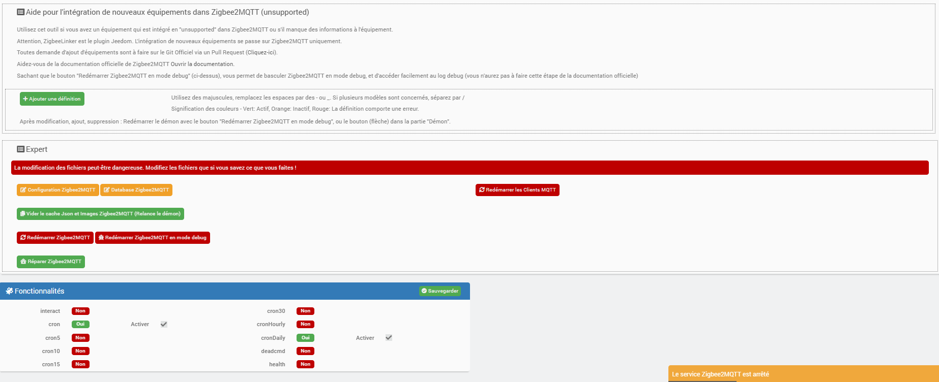 Pour info, dans la situation actuelle, « Zigbee2MQTT est arrêté » s’affiche en permanence comme on peut le voir sur une impression écran, je n’ai plus accès au client MQTT local :