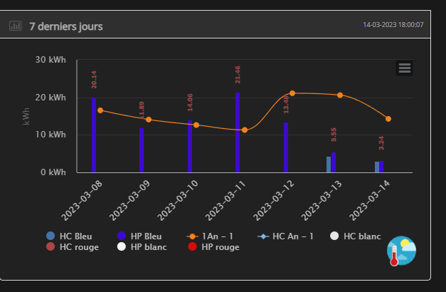 Sur mes jeux d’essai les conso sont empilés, mais je n’ai pas suffisamment d’historique. Le fait que tu en ais un, implique certainement qu’ils soient cote à cote comme le tarif HCHP. C’est fait normalement pour différencier la comparaison entre les HP et les HC. j’avoue pour que pour Tempo, je m’étais pas trop posé la question. Du coup en fonction des cas (avant tarif Base ou tarif HCHP), je ne sais ce qui est le mieux. Il faut que je réfléchisse. Je pense que je ne pourrais pas faire de miracle.