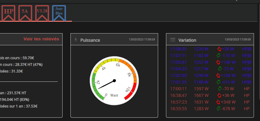 J’ai récupéré le PTEC avec LTARF de la téléinfo ca semble marcher