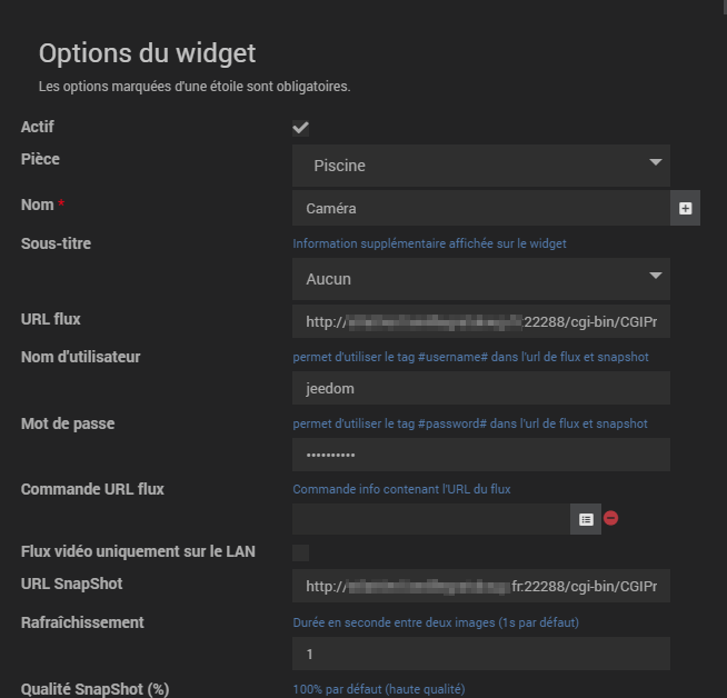 Bref, la seul config qui marche c’est le champ url de flux remplie avec l’URL de snapshot, sans cocher la case « Flux vidéo uniquement sur le LAN »