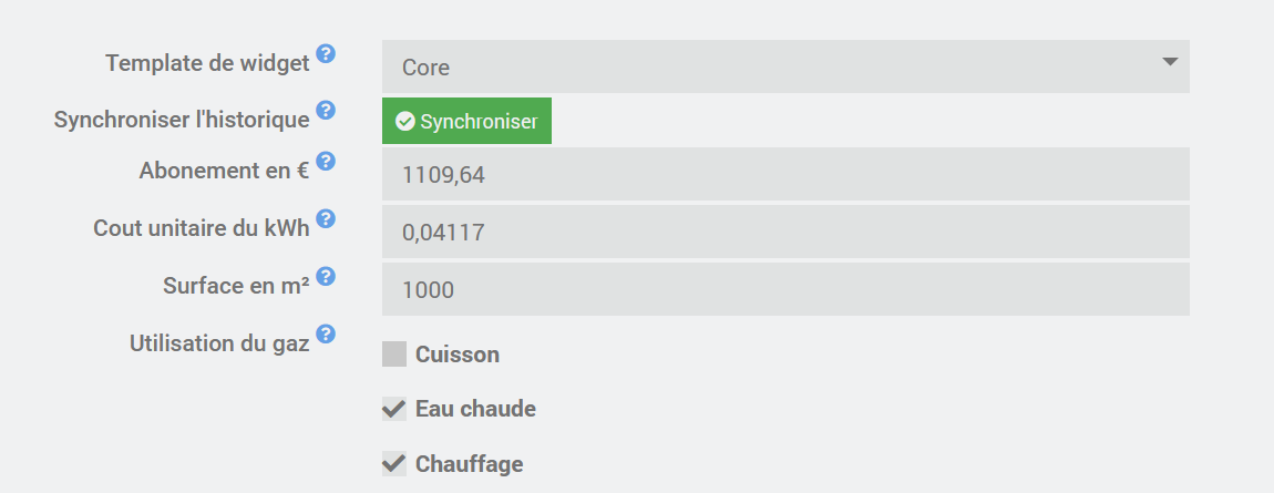 Concernant l’abonnement, l’infobulle précise qu’il s’agit d’un montant annuel, ce qui est cohérent avec ce que j’ai saisi. J’ai d’ailleurs confirmé cela en faisant le calcul : 1109 € / 12 ≈ 3 €, ce qui correspond bien au montant affiché dans Jeedom.