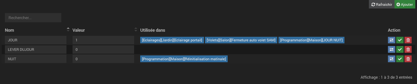 Voici les variables créées parmi lesquels la variable nommée JOUR que je reprends dans le scenario « JOUR NUIT » voir photo ci dessous