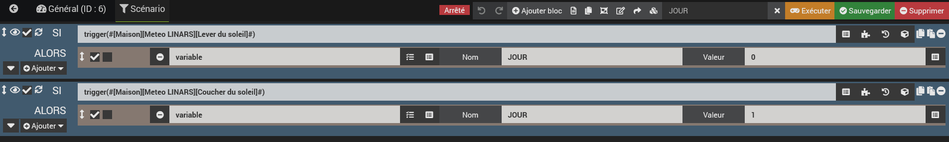 J’ai créé ensuite le scenario nommé JOUR NUIT et j’utilise le plugin meteo weather.