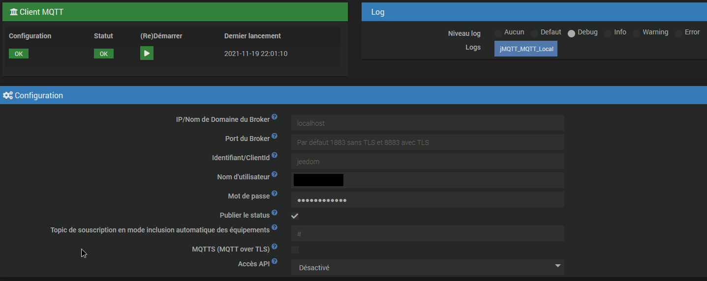 Suite au crash de mon Pi4, je viens de refaire une installation complète de mon SSD avec la restauration de mon dernier backup Jeedom. Suite à cette manipulation, tous les protocoles fonctionnent correctement sauf MQTT.