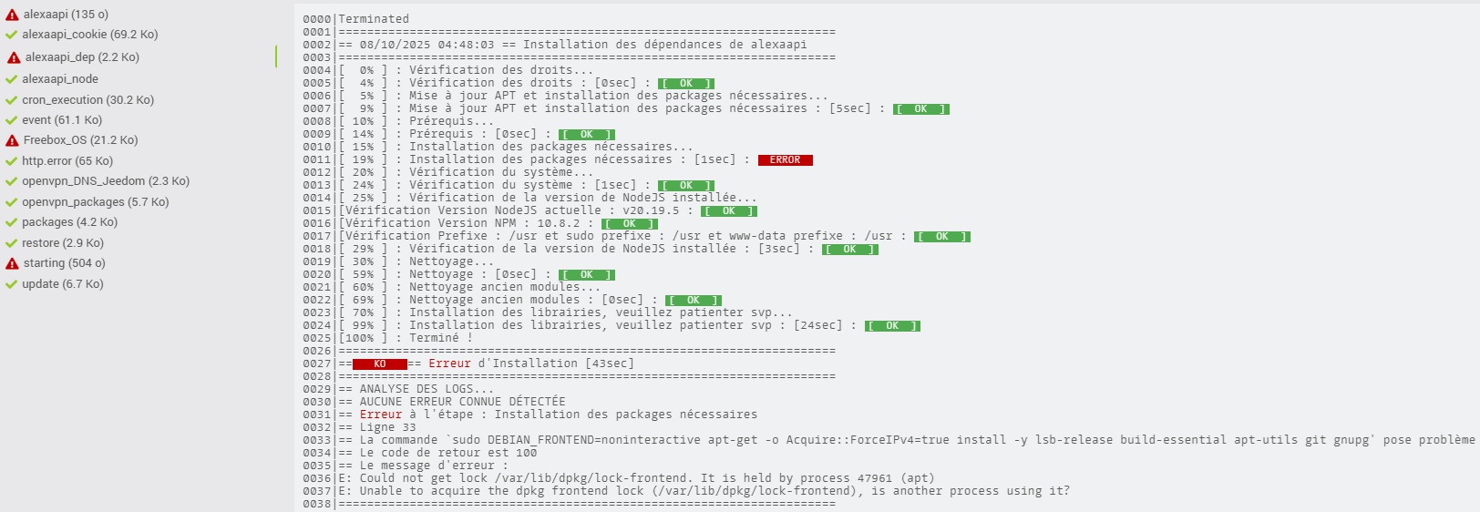 0011|[ 19% ] : Installation des packages nécessaires : [1sec] : ERROR