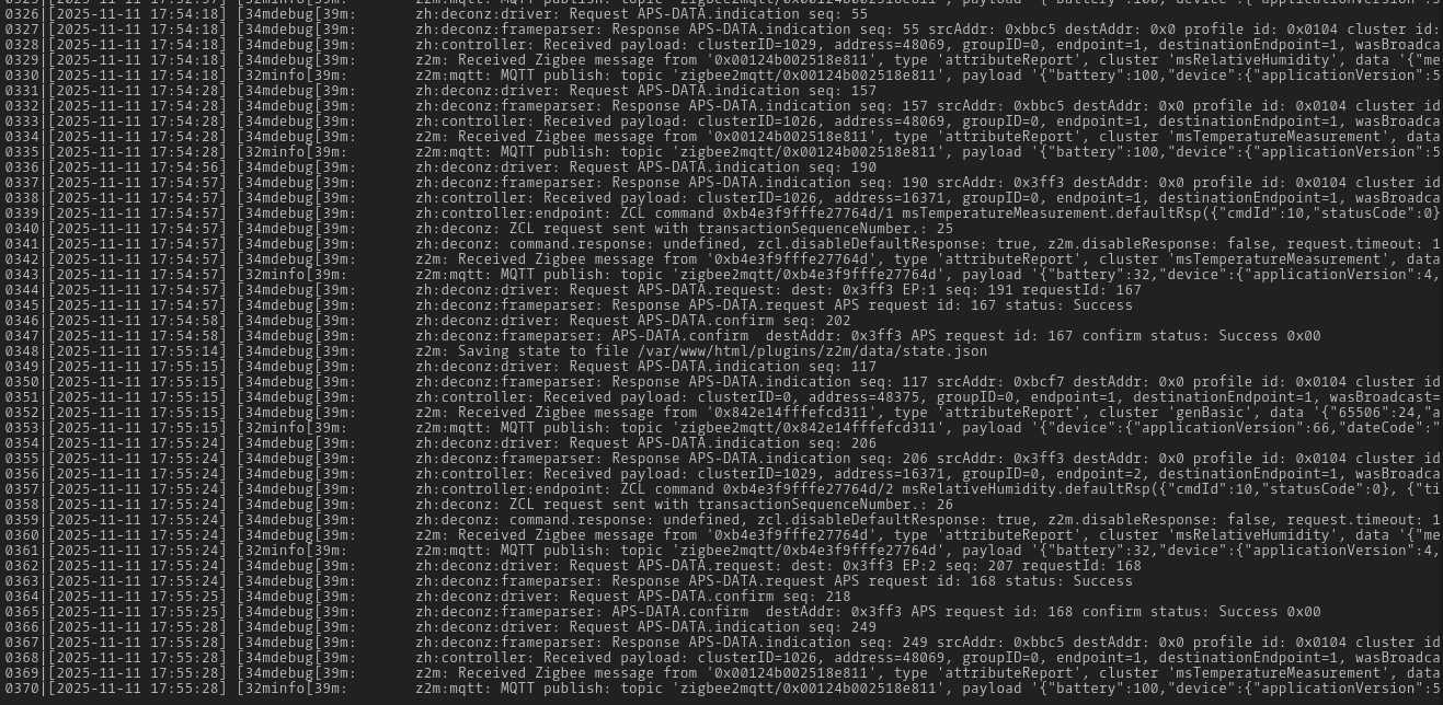 0227|[2025-11-11 17:47:46] e[34mdebuge[39m: z2m: Received Zigbee message from '0x00124b002518e811', type 'attributeReport', cluster 'msRelativeHumidity', data '{"measuredValue":6732}' from endpoint 1 with groupID 0