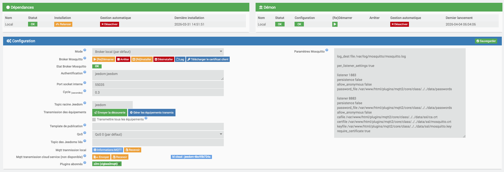 [2026-04-03 15:50:34,785] DEBUG JMsg.Snd SockOut send() : Sent TO Jeedom 2 messages handled in 63.257456ms (qToJ size 0): [{'cmd': 'messageIn', 'id': '64', 'topic': 'zigbee2mqtt/bridge/logging', 'payload': '{"level":"info","message":"z2m:mqtt: MQTT publish: topic \'zigbee2mqtt/0xa4c13814876e5858\', payload \'{\\"ac_frequency\\":49,\\"current_a\\":0,\\"current_b\\":5.257,\\"device\\":{\\"applicationVersion\\":74,\\"dateCode\\":\\"\\",\\"friendlyName\\":\\"0xa4c13814876e5858\\",\\"hardwareVersion\\":1,\\"ieeeAddr\\":\\"0xa4c13814876e5858\\",\\"manufacturerID\\":4417,\\"manufacturerName\\":\\"_TZE204_81yrt3lo\\",\\"model\\":\\"PJ-1203A\\",\\"networkAddress\\":19744,\\"powerSource\\":\\"Mains (single phase)\\",\\"stackVersion\\":0,\\"type\\":\\"Router\\",\\"zclVersion\\":3},\\"energy_a\\":0,\\"energy_b\\":5104.32,\\"energy_flow_a\\":\\"consuming\\",\\"energy_flow_b\\":\\"consuming\\",\\"energy_produced_a\\":345.86,\\"energy_produced_b\\":0,\\"last_seen\\":\\"2026-04-03T13:50:34.649Z\\",\\"linkquality\\":136,\\"power_a\\":0,\\"power_ab\\":1111.3,\\"power_b\\":1111.3,\\"power_factor_a\\":100,\\"power_factor_b\\":93,\\"timestamp_a\\":\\"2026-04-03T13:50:31.198Z\\",\\"timestamp_b\\":\\"2026-04-03T13:50:31.750Z\\",\\"update_frequency\\":10,\\"voltage\\":225.3}\'"}', 'qos': 0, 'retain': False}, {'cmd': 'messageIn', 'id': '64', 'topic': 'zigbee2mqtt/0xa4c13814876e5858', 'payload': '{"ac_frequency":49,"current_a":0,"current_b":5.257,"device":{"applicationVersion":74,"dateCode":"","friendlyName":"0xa4c13814876e5858","hardwareVersion":1,"ieeeAddr":"0xa4c13814876e5858","manufacturerID":4417,"manufacturerName":"_TZE204_81yrt3lo","model":"PJ-1203A","networkAddress":19744,"powerSource":"Mains (single phase)","stackVersion":0,"type":"Router","zclVersion":3},"energy_a":0,"energy_b":5104.32,"energy_flow_a":"consuming","energy_flow_b":"consuming","energy_produced_a":345.86,"energy_produced_b":0,"last_seen":"2026-04-03T13:50:34.649Z","linkquality":136,"power_a":0,"power_ab":1111.3,"power_b":1111.3,"power_factor_a":100,"power_factor_b":93,"timestamp_a":"2026-04-03T13:50:31.198Z","timestamp_b":"2026-04-03T13:50:31.750Z","update_frequency":10,"voltage":225.3}', 'qos': 0, 'retain': False}]