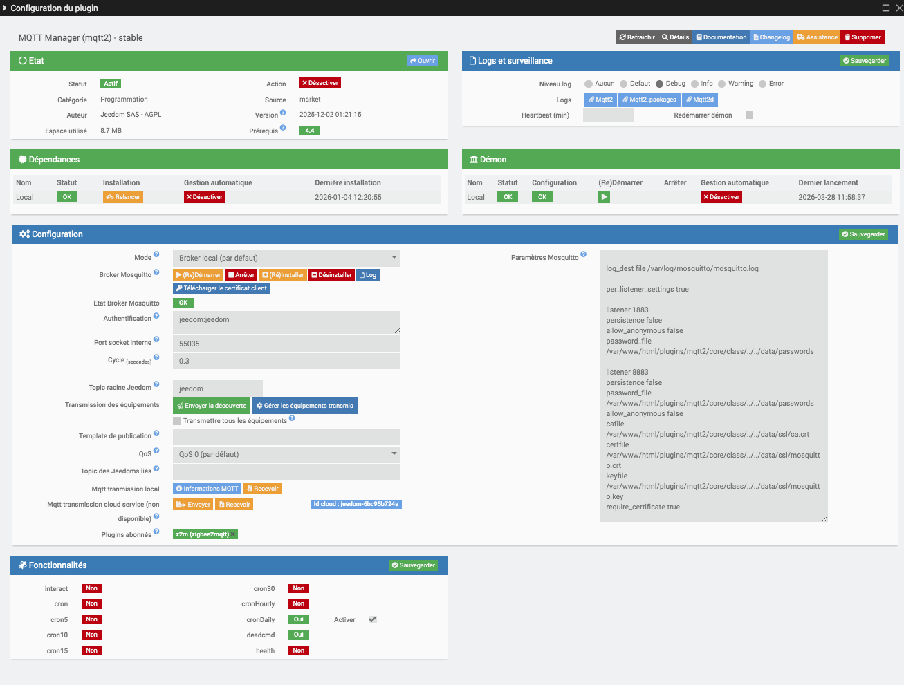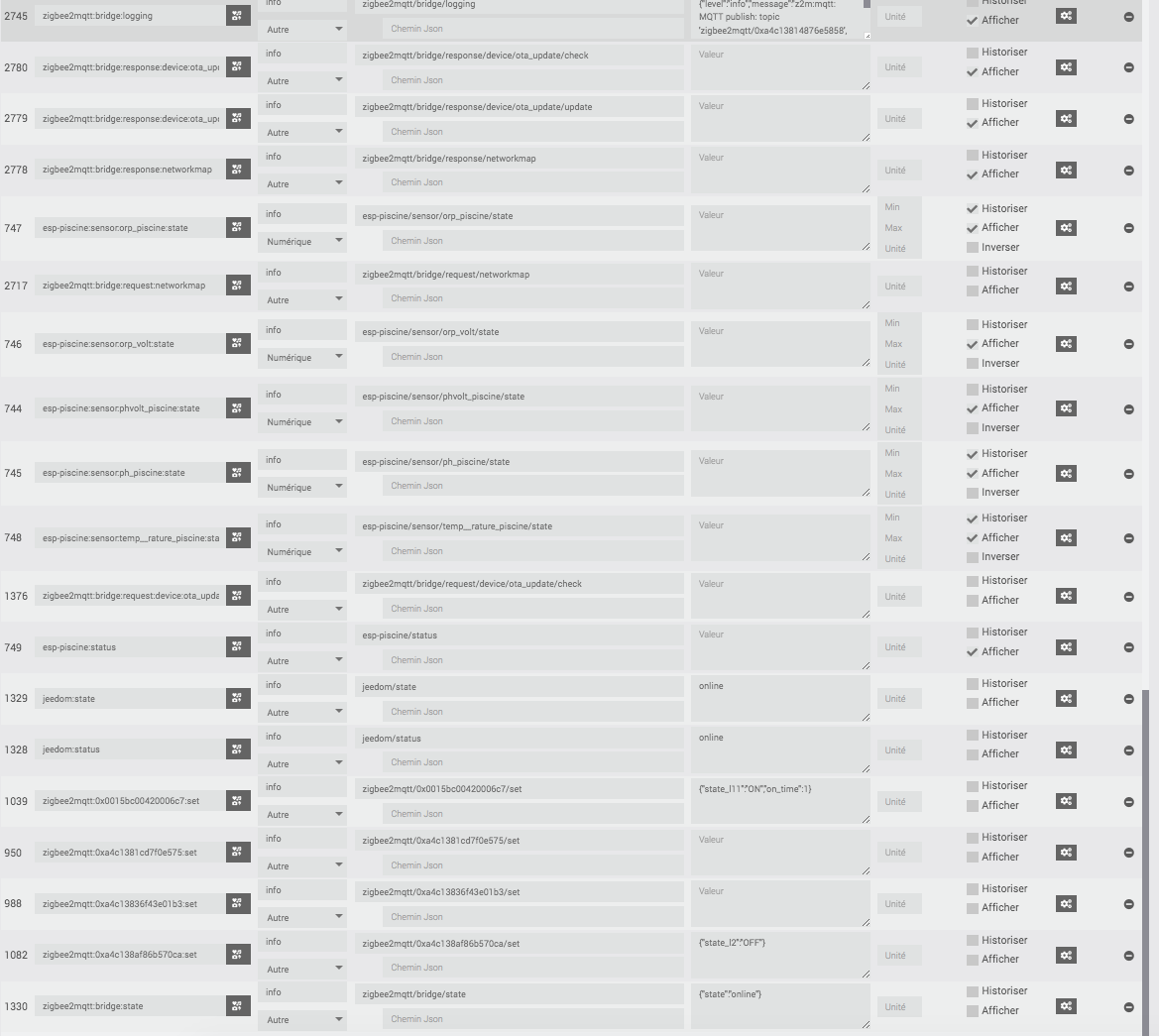 [2026-04-03 15:50:32,114] DEBUG JMsg.Snd SockOut send() : Sent TO Jeedom 4 messages handled in 107.437849ms (qToJ size 0): [{'cmd': 'messageIn', 'id': '64', 'topic': 'zigbee2mqtt/bridge/logging', 'payload': '{"level":"info","message":"z2m:mqtt: MQTT publish: topic \'zigbee2mqtt/0xa4c13814876e5858\', payload \'{\\"ac_frequency\\":49,\\"current_a\\":0,\\"current_b\\":5.257,\\"device\\":{\\"applicationVersion\\":74,\\"dateCode\\":\\"\\",\\"friendlyName\\":\\"0xa4c13814876e5858\\",\\"hardwareVersion\\":1,\\"ieeeAddr\\":\\"0xa4c13814876e5858\\",\\"manufacturerID\\":4417,\\"manufacturerName\\":\\"_TZE204_81yrt3lo\\",\\"model\\":\\"PJ-1203A\\",\\"networkAddress\\":19744,\\"powerSource\\":\\"Mains (single phase)\\",\\"stackVersion\\":0,\\"type\\":\\"Router\\",\\"zclVersion\\":3},\\"energy_a\\":0,\\"energy_b\\":5104.32,\\"energy_flow_a\\":\\"consuming\\",\\"energy_flow_b\\":\\"consuming\\",\\"energy_produced_a\\":345.86,\\"energy_produced_b\\":0,\\"last_seen\\":\\"2026-04-03T13:50:31.903Z\\",\\"linkquality\\":136,\\"power_a\\":0,\\"power_ab\\":1111.3,\\"power_b\\":1111.3,\\"power_factor_a\\":100,\\"power_factor_b\\":93,\\"timestamp_a\\":\\"2026-04-03T13:50:31.198Z\\",\\"timestamp_b\\":\\"2026-04-03T13:50:31.750Z\\",\\"update_frequency\\":10,\\"voltage\\":225.3}\'"}', 'qos': 0, 'retain': False}, {'cmd': 'messageIn', 'id': '64', 'topic': 'zigbee2mqtt/0xa4c13814876e5858', 'payload': '{"ac_frequency":49,"current_a":0,"current_b":5.257,"device":{"applicationVersion":74,"dateCode":"","friendlyName":"0xa4c13814876e5858","hardwareVersion":1,"ieeeAddr":"0xa4c13814876e5858","manufacturerID":4417,"manufacturerName":"_TZE204_81yrt3lo","model":"PJ-1203A","networkAddress":19744,"powerSource":"Mains (single phase)","stackVersion":0,"type":"Router","zclVersion":3},"energy_a":0,"energy_b":5104.32,"energy_flow_a":"consuming","energy_flow_b":"consuming","energy_produced_a":345.86,"energy_produced_b":0,"last_seen":"2026-04-03T13:50:31.903Z","linkquality":136,"power_a":0,"power_ab":1111.3,"power_b":1111.3,"power_factor_a":100,"power_factor_b":93,"timestamp_a":"2026-04-03T13:50:31.198Z","timestamp_b":"2026-04-03T13:50:31.750Z","update_frequency":10,"voltage":225.3}', 'qos': 0, 'retain': False}, {'cmd': 'messageIn', 'id': '64', 'topic': 'zigbee2mqtt/bridge/logging', 'payload': '{"level":"info","message":"z2m:mqtt: MQTT publish: topic \'zigbee2mqtt/0xa4c13814876e5858\', payload \'{\\"ac_frequency\\":49,\\"current_a\\":0,\\"current_b\\":5.257,\\"device\\":{\\"applicationVersion\\":74,\\"dateCode\\":\\"\\",\\"friendlyName\\":\\"0xa4c13814876e5858\\",\\"hardwareVersion\\":1,\\"ieeeAddr\\":\\"0xa4c13814876e5858\\",\\"manufacturerID\\":4417,\\"manufacturerName\\":\\"_TZE204_81yrt3lo\\",\\"model\\":\\"PJ-1203A\\",\\"networkAddress\\":19744,\\"powerSource\\":\\"Mains (single phase)\\",\\"stackVersion\\":0,\\"type\\":\\"Router\\",\\"zclVersion\\":3},\\"energy_a\\":0,\\"energy_b\\":5104.32,\\"energy_flow_a\\":\\"consuming\\",\\"energy_flow_b\\":\\"consuming\\",\\"energy_produced_a\\":345.86,\\"energy_produced_b\\":0,\\"last_seen\\":\\"2026-04-03T13:50:31.983Z\\",\\"linkquality\\":136,\\"power_a\\":0,\\"power_ab\\":1111.3,\\"power_b\\":1111.3,\\"power_factor_a\\":100,\\"power_factor_b\\":93,\\"timestamp_a\\":\\"2026-04-03T13:50:31.198Z\\",\\"timestamp_b\\":\\"2026-04-03T13:50:31.750Z\\",\\"update_frequency\\":10,\\"voltage\\":225.3}\'"}', 'qos': 0, 'retain': False}, {'cmd': 'messageIn', 'id': '64', 'topic': 'zigbee2mqtt/0xa4c13814876e5858', 'payload': '{"ac_frequency":49,"current_a":0,"current_b":5.257,"device":{"applicationVersion":74,"dateCode":"","friendlyName":"0xa4c13814876e5858","hardwareVersion":1,"ieeeAddr":"0xa4c13814876e5858","manufacturerID":4417,"manufacturerName":"_TZE204_81yrt3lo","model":"PJ-1203A","networkAddress":19744,"powerSource":"Mains (single phase)","stackVersion":0,"type":"Router","zclVersion":3},"energy_a":0,"energy_b":5104.32,"energy_flow_a":"consuming","energy_flow_b":"consuming","energy_produced_a":345.86,"energy_produced_b":0,"last_seen":"2026-04-03T13:50:31.983Z","linkquality":136,"power_a":0,"power_ab":1111.3,"power_b":1111.3,"power_factor_a":100,"power_factor_b":93,"timestamp_a":"2026-04-03T13:50:31.198Z","timestamp_b":"2026-04-03T13:50:31.750Z","update_frequency":10,"voltage":225.3}', 'qos': 0, 'retain': False}]