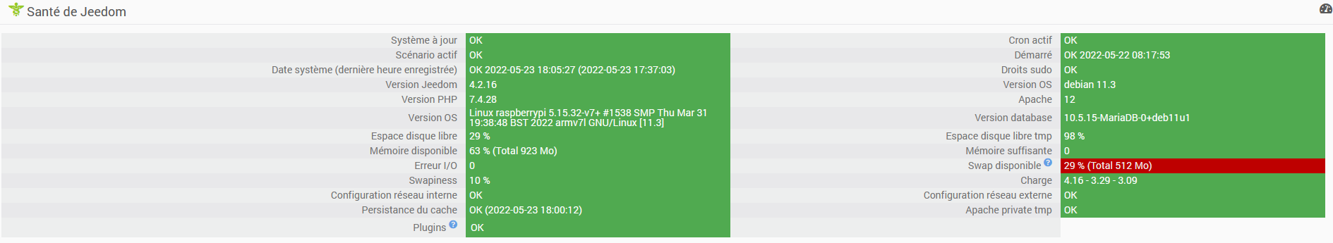 Une capture d’écran de la page santé de mon Jeedom :