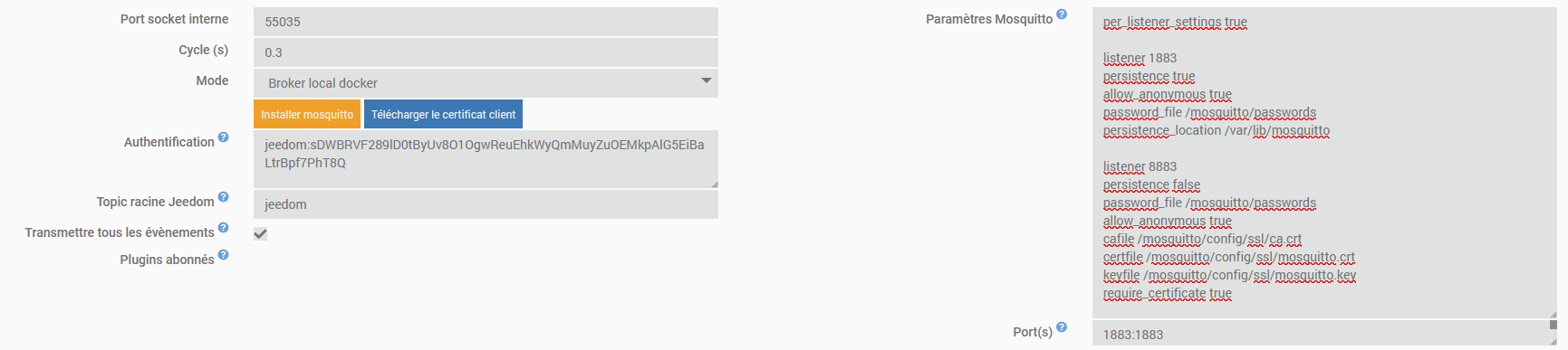J’ai donc installé sur mon Jeedom V4 les plugins Docker Management et MQTT2. Voilà un peu l’état des lieux de ma config MQTT2 :
