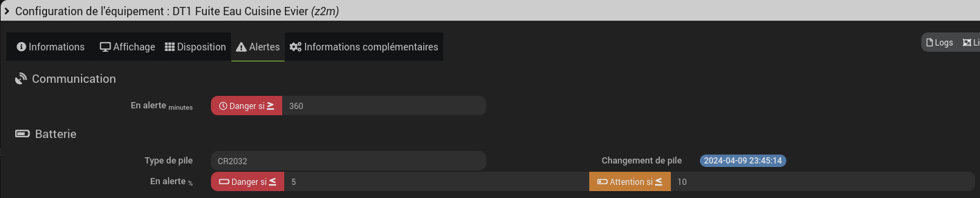 Regarde la configuration avancé de l’équipement dans jeedom tu as un onglet alerte tu as tout dedans et c’est valable quelque soit l’équipement