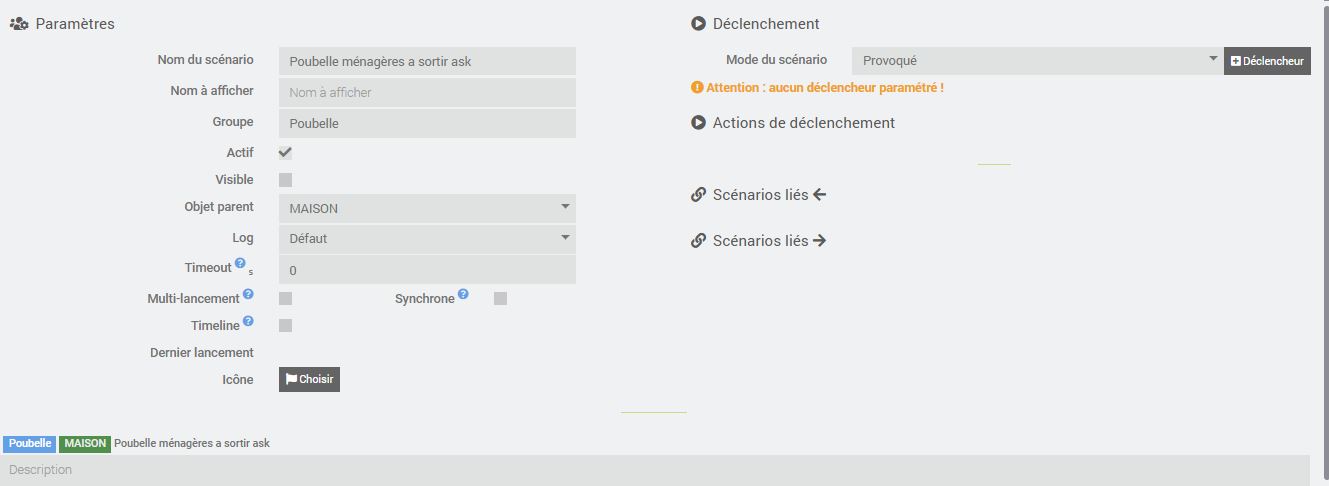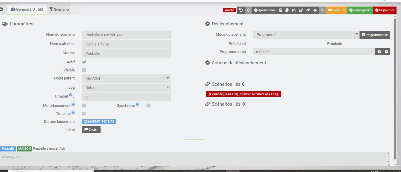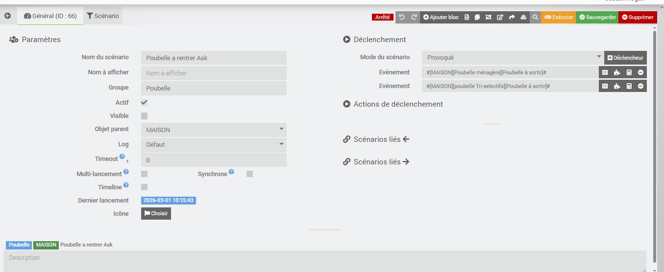 [2026-03-01 20:20:13][SCENARIO] -- Début : . Tags : {"#trigger#":"scenario","#trigger_name#":"[Poubelle][MAISON][Poubelle ménagères a sortir ask]","#trigger_id#":"80","#trigger_message#":"Lancement provoqué par le scénario : [Poubelle][MAISON][Poubelle ménagères a sortir ask]","#trigger_value#":""}