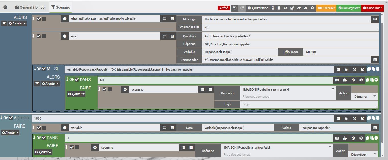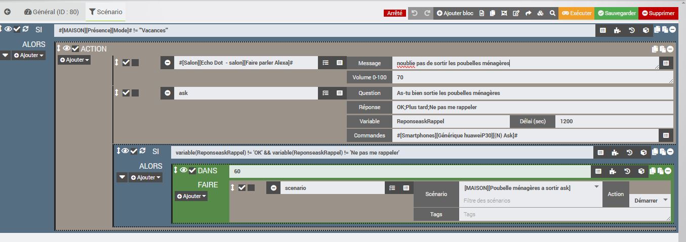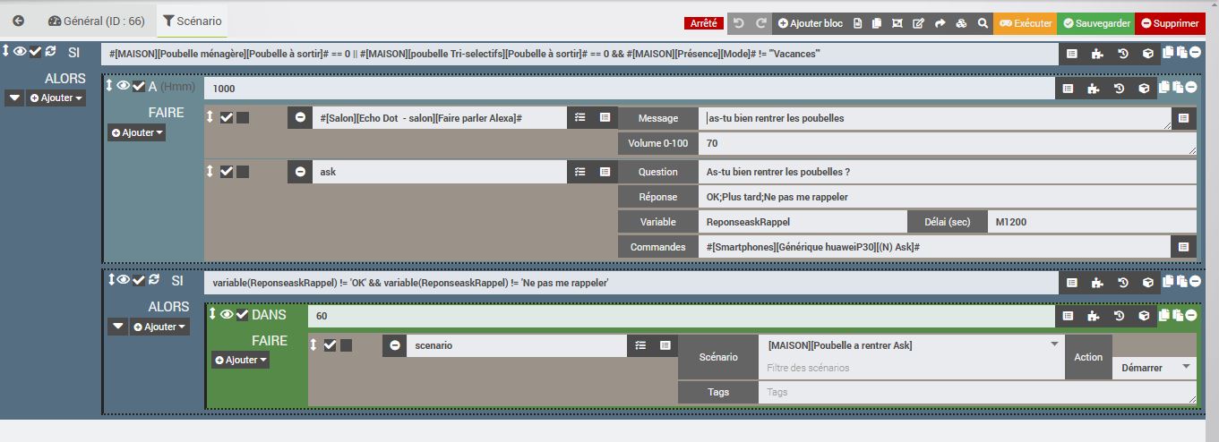 Quand l’état change, donc avant la maj, il passait a 1 quand l’état passe en ramassage puis a 0 une fois l’heure de la poubelle ramassait alors le scénario se déclenche, Si l’état est a 0 alors a 10h, j’envoie une ask et selon la réponse; le scénario redémarre 60 min après