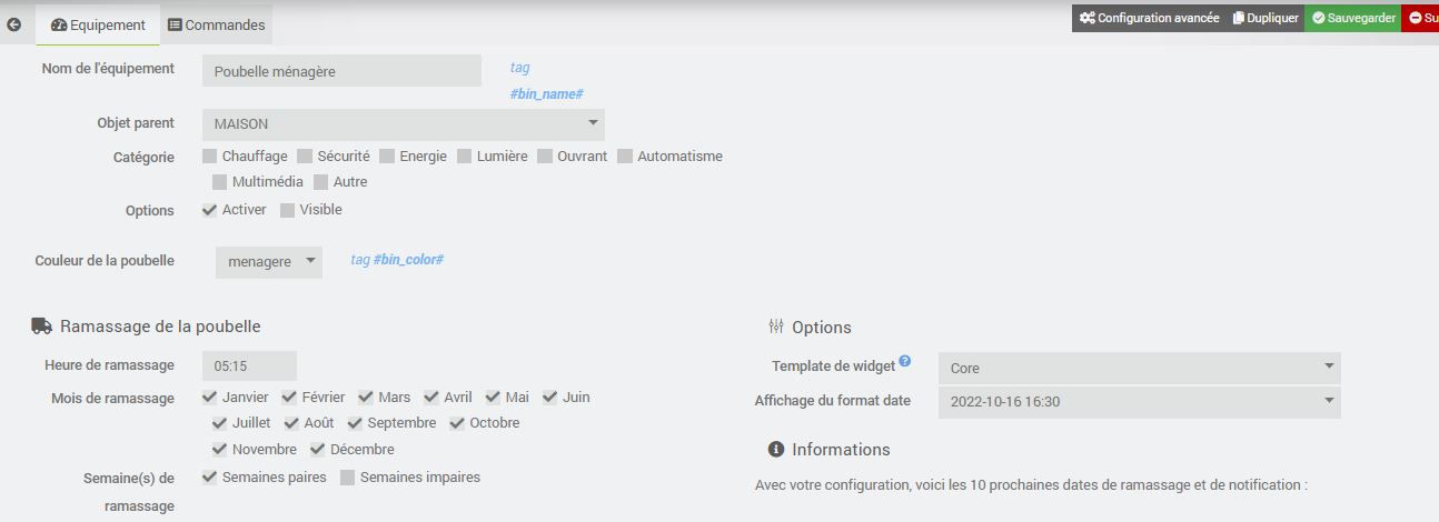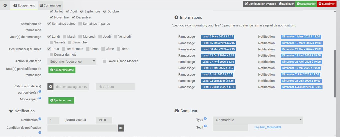 J’ai depuis très peu de temps réaliser la Maj de Jeedom 4.5 ainsi que celle du plugin MyBin et dorénavant mon scénario pour rentrer les poubelles et déclenché a 10h du matin la veille du jour de ramassage.Auparavant je faisais déclencher ce scénario par « l’action de ramassage », c’est a dire le jour de ramassage mais dorénavant il semblerait que « l’action de ramassage » serait déclenché la veille !
