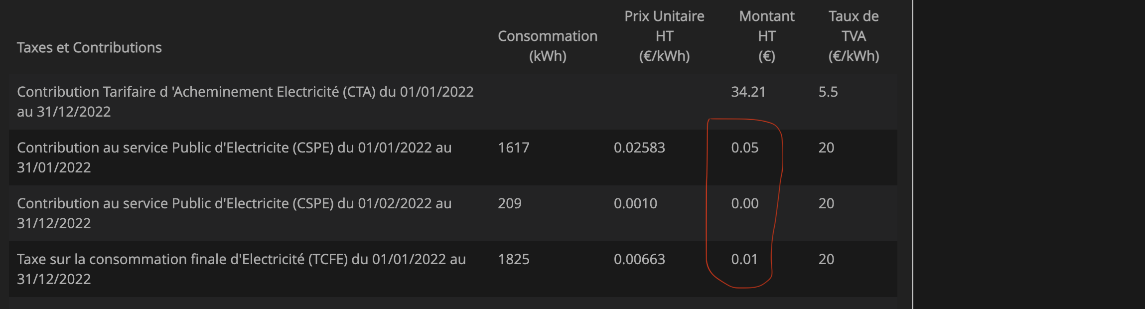 Je pense qu’il y a un souci dans la présentation de la facture dans la partie concernant les « Taxes et Contributions », les montants affichés dans la colonne « Montant HT » ne correspondent pas aux produits des 2 colonnes précédentes