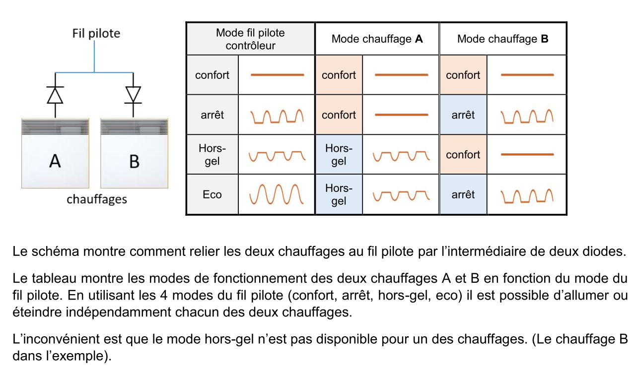Voici une méthode qui permet de piloter indépendamment deux zones de radiateurs avec un seul fil pilote en mode tout ou rien (Allumé / Éteind). Une des zones est pilotée en mode Confort/Hors Gel, et l’autre zone en mode Confort/Arrêt. C’est parfait pour faire un thermostat piloté par Jeedom en faisant des économies sur les modules fil pilote.