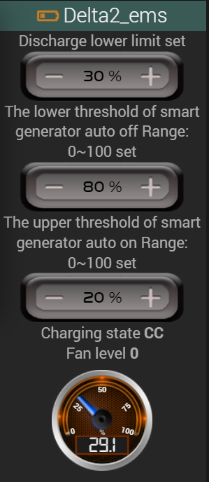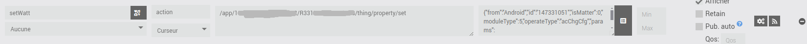 La valeur est tirée de la docs API Ecoflow légèrement modifiée (j’ai repris celle-ci de l’appli offcielle) : {"from":"Android","id":"147331051","isMatter":0,"moduleType":5,"operateType":"acChgCfg","params":{"chgWatts":#slider#,"chgPauseFlag":255},"version":"1.0"}