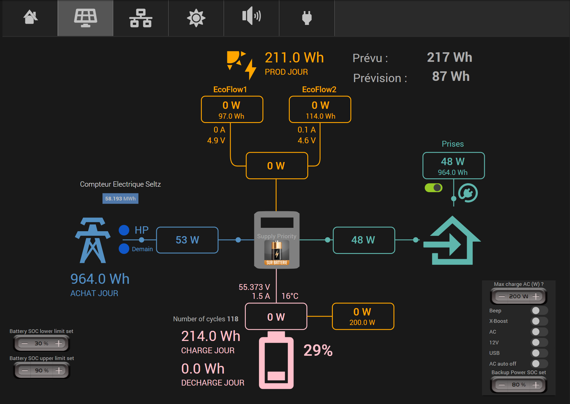 Mon surplus n’est pas fixe, il varie tout le temps. Mais mes Delta2 permettent de brider la puissance de recharge de 200W à 1200W depuis l’application. L’idée est donc de configurer la recharge en fonction du surplus disponible. Lorsque j’ai du surplus, j’active la prise télécommandée de mon delta le plus déchargé pour l’allumer, puis je règle la puissance de charge au fil de l’eau selon la puissance solaire disponible.