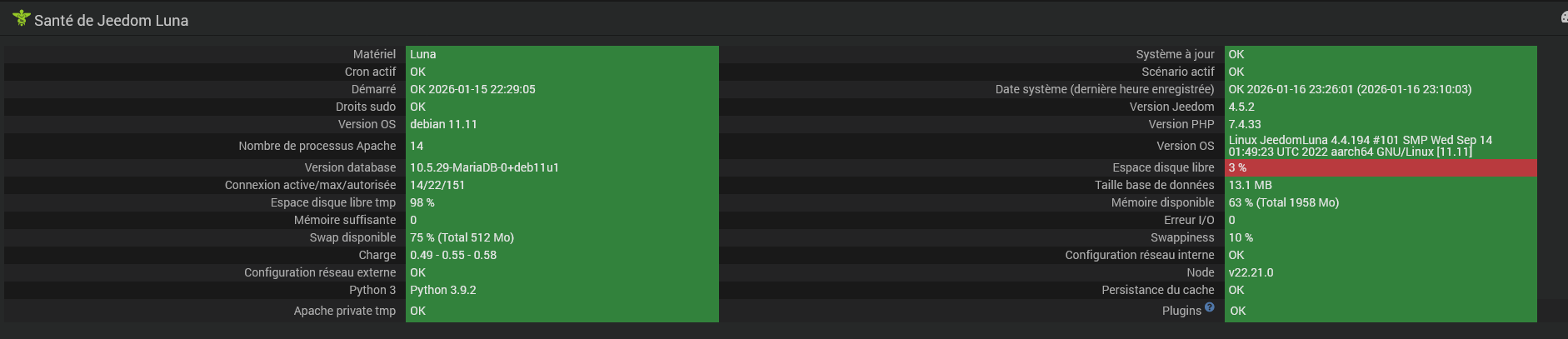 Je me retrouve avec plusieurs plantages de ma box Jeedom Luna. Je suis allé faire un tour sur la page Santé qui me donne un espace disque libre de 3%.