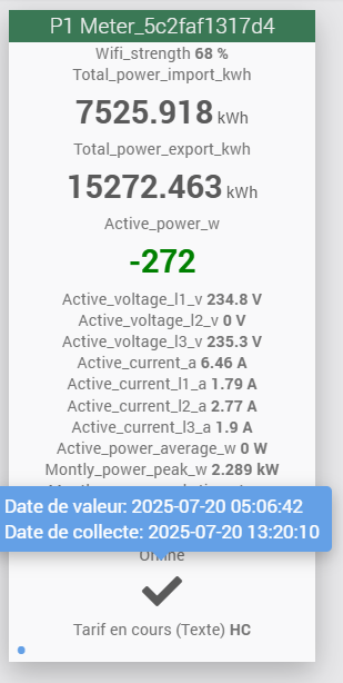 [20-07-2025 15:56:05] DEBUG : Event reçu de P1 Meter(5c2faf0acdc0) de type HWE-P1 : {"wifi_ssid":"PrivateNebz","wifi_strength":100,"smr_version":50,"meter_model":"Fluvius 253770234_A","unique_id":"3153414731313030353537353138","active_tariff":2,"total_power_import_kwh":9598.299,"total_power_import_t1_kwh":4024.277,"total_power_import_t2_kwh":5574.022,"total_power_export_kwh":5744.099,"total_power_export_t1_kwh":4099.4,"total_power_export_t2_kwh":1644.699,"active_power_w":-1236,"active_power_l1_w":-1236,"active_voltage_l1_v":241.5,"active_current_a":5.25,"active_current_l1_a":5.25,"active_power_average_w":0,"montly_power_peak_w":2521,"montly_power_peak_timestamp":250705220000,"external":[]}