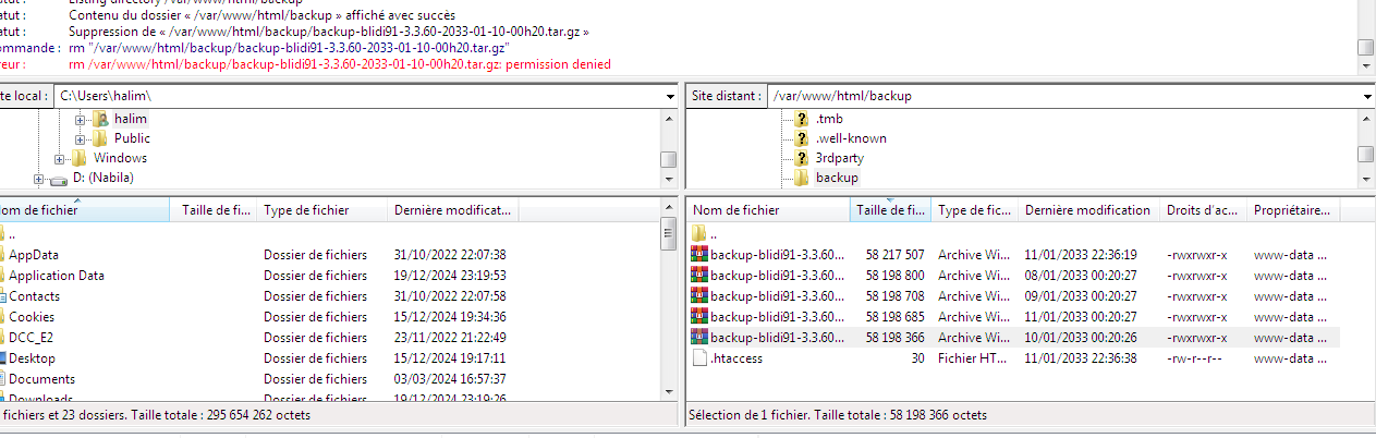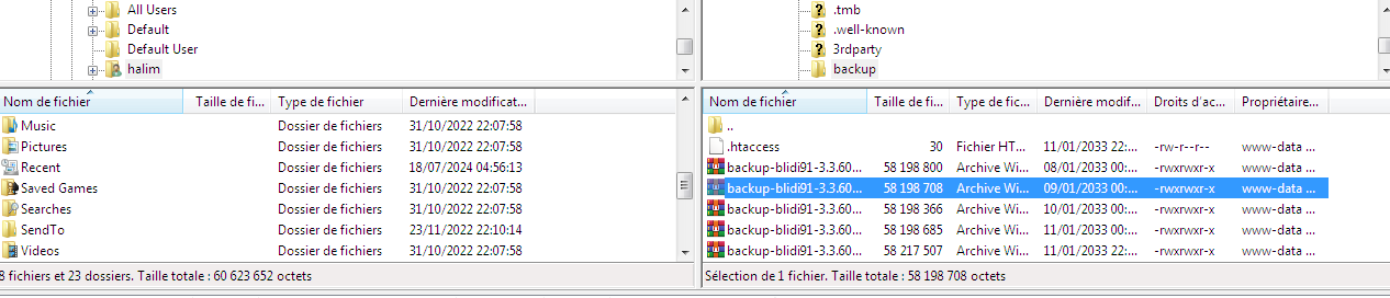- Dans le répertoire des sauvegardes, laisse uniquement celle que tu souhaites restaurer. Donc avec ton FileZilla, efface les autres … n’en laisse qu’une seule.