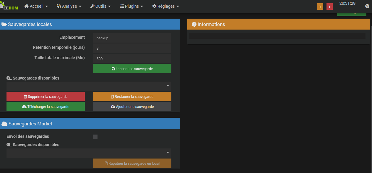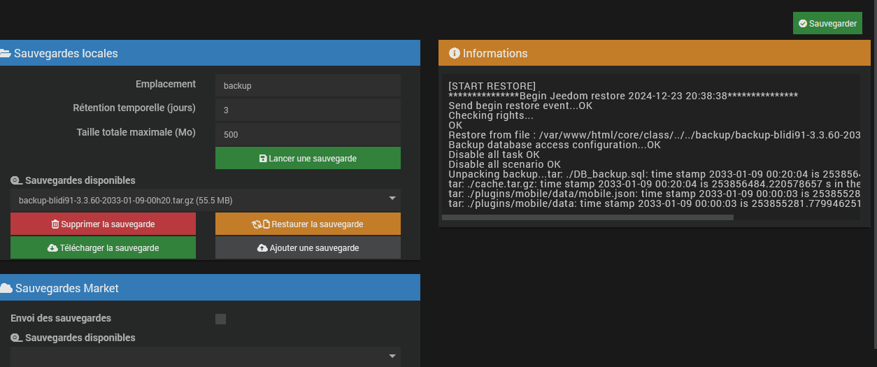 Après l’upload vers Jeedom, tu la sélectionnes depuis la liste déroulante et tu cliques sur ‘restaurer la sauvegarde’