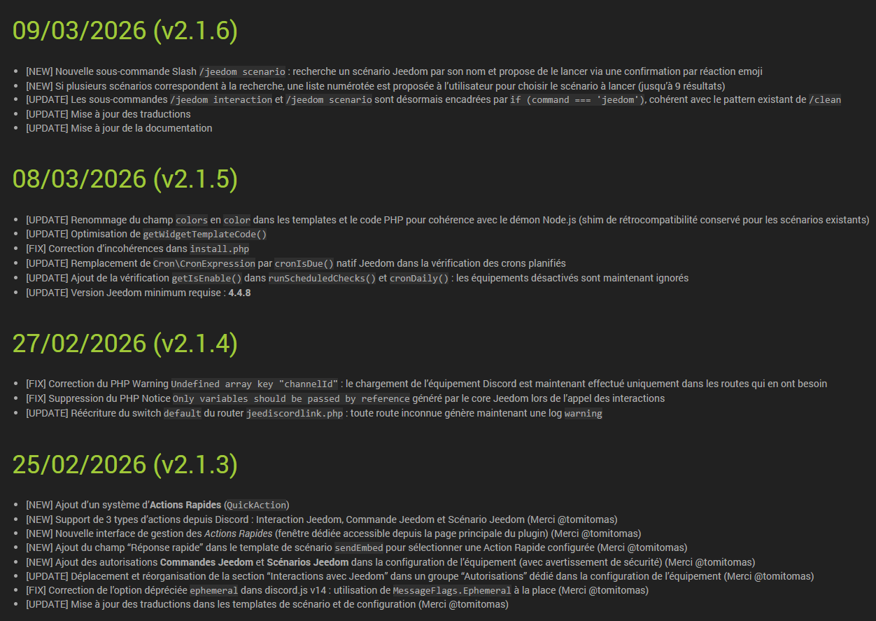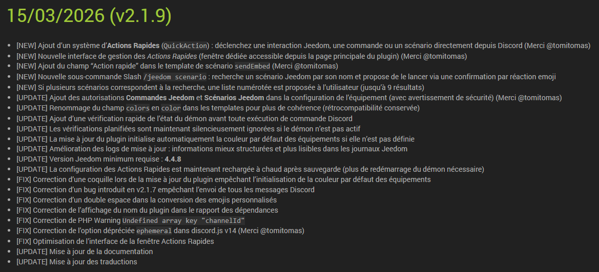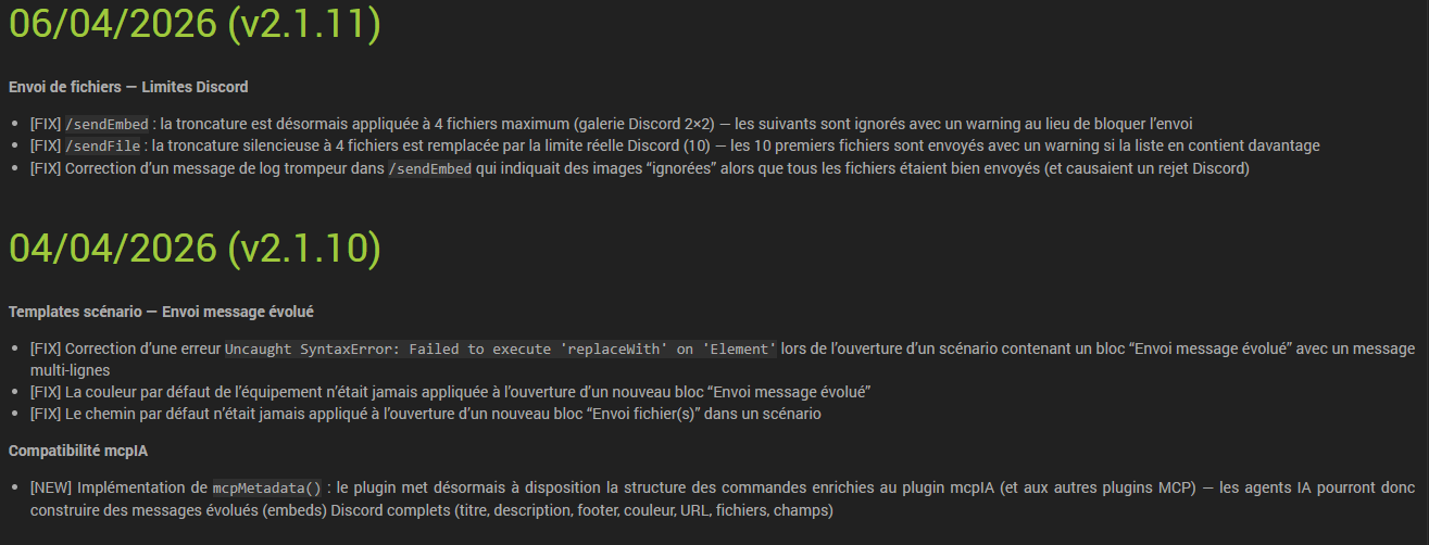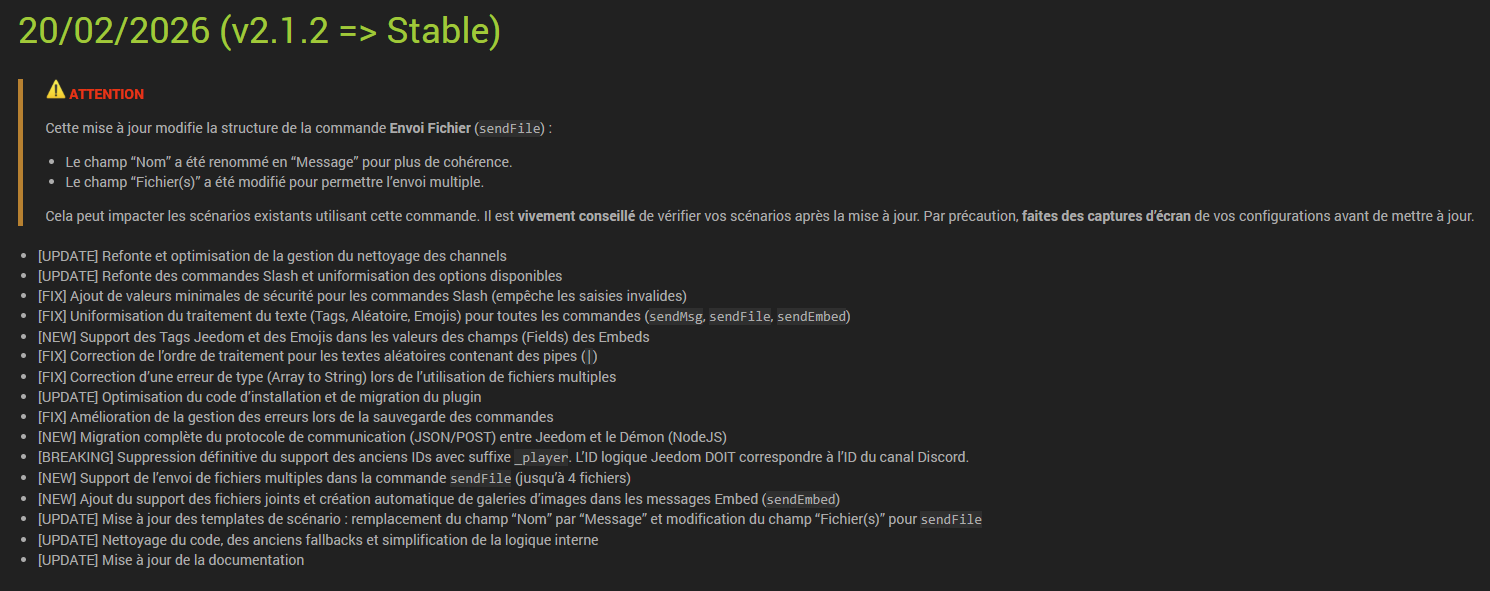 Cette version v2 a été réécrite en grande partie, afin de prendre en compte les dernières versions de la lib Node JS de Discord (v14), utilisée dans le plugin.