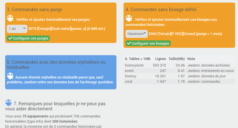 Page Wizard pour corriger facilement les problèmes (crons, configuration de Jeedom, purge/lissage des commandes, orphelins, taille de la base de données).