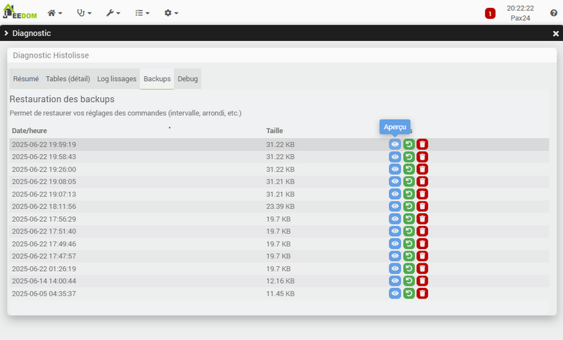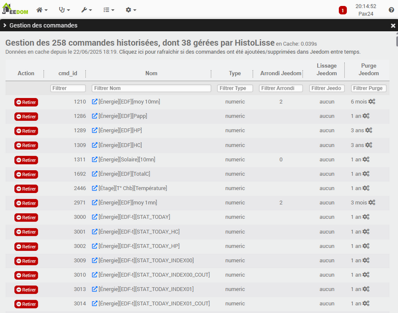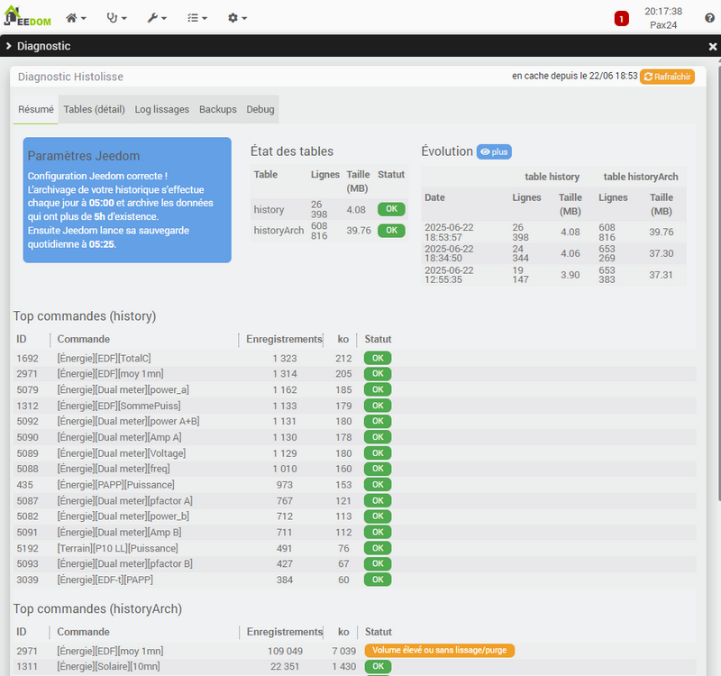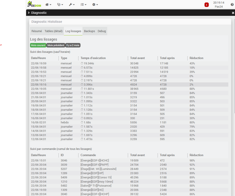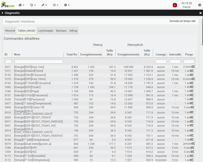 Dans mon cas c’est une taille pour historyArch divisée par 3 (par 2 pour history) sans rien perdre de l’utilité informative de mon historique, c’est un temps pour le backup Jeedom réduit de 60% et un affichage des graphs temps réel enfin fluide.