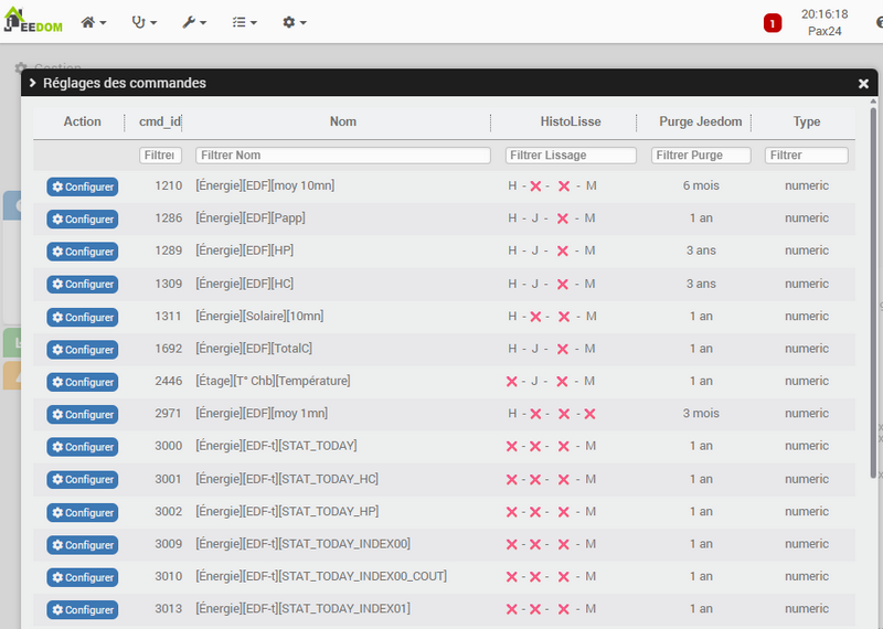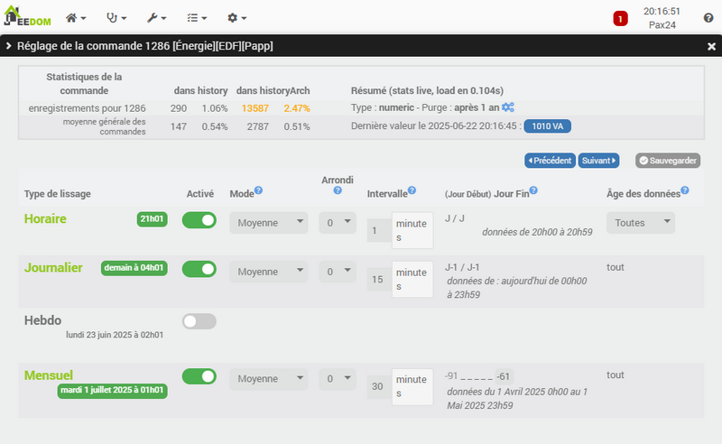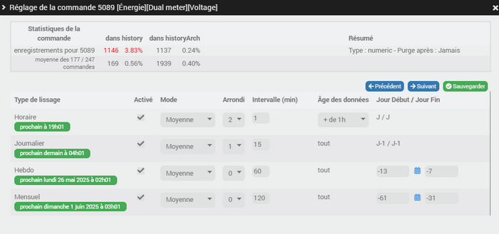 Dans mon cas, hors de question de le lisser à 1mn parce que je fais des calculs avec et que je gère du délestage, j’ai besoin de réactivité en temps réel : par contre au delà de 10mn je n’en ai plus besoin. Dans historyArch, je garde les données pour pouvoir comparer mon mois avec le mois de l’année précédente, notamment analyser par rapport au solaire et checker les ombrages etc… et aussi le comparer à ma conso Enedis qui est en 1 pour 15mn.