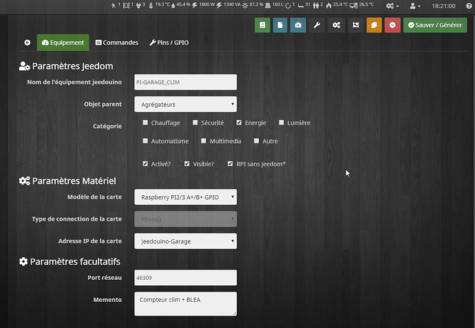 Enfin, vu que mon système de scénario détecte bien l’arrêt (en général 1 à 2 fois par semaine tout au plus sur 5 démons de comptage au total), je ne fais que faire tout le temps la même chose, j’ouvre le device jeedouino ext correspondant et je clique sur Sauver/Générer :