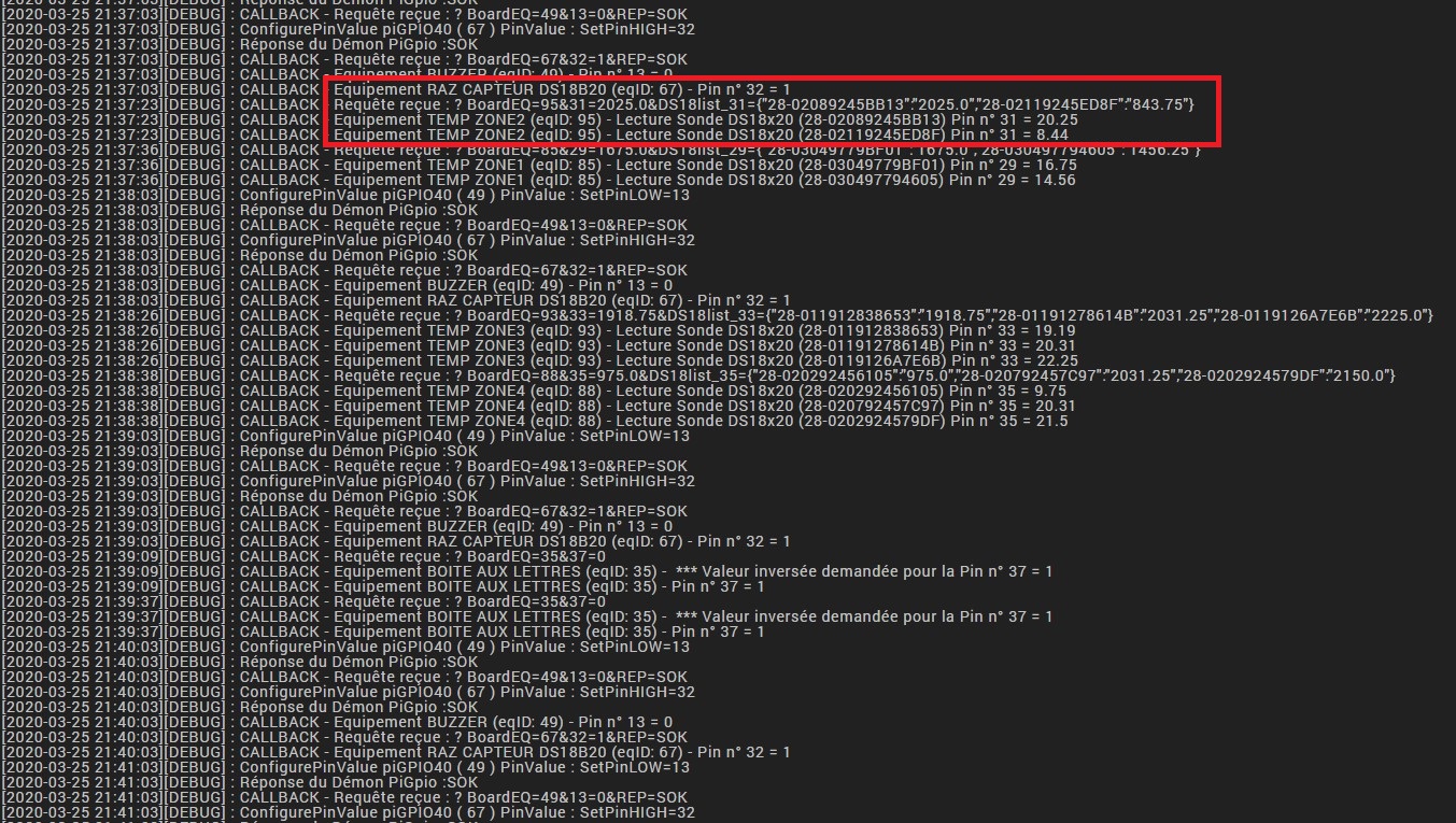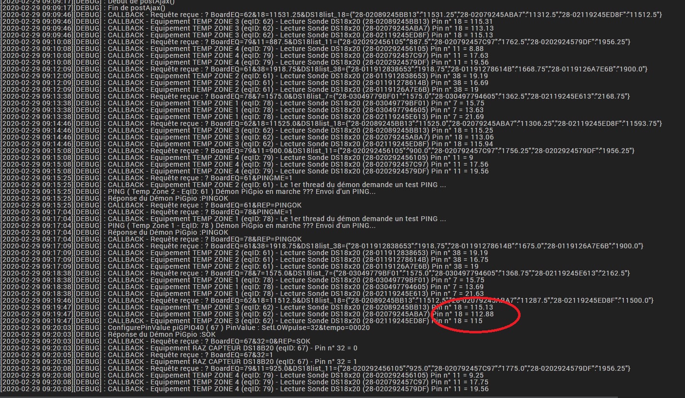 en regardant tes logs, je m’aperçois que les sondes sont biens détectées mais elles donnent de mauvaises valeurs. N’aurais tu pas des parasites sur cette ligne. Quelle longueur tu as entre ta carte et tes sondes, tes fils sont blindés?