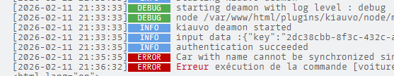 0033|[2026-02-11 21:36:32] ERROR Erreur exécution de la commande [voiture][EV6][déverrouiller] : Le démon kiauvo n'a pas réussi a traiter la demande. Details : http://127.0.0.1:8090/cars//lock.disable?key=****** status : 404 , message : <!DOCTYPE html>