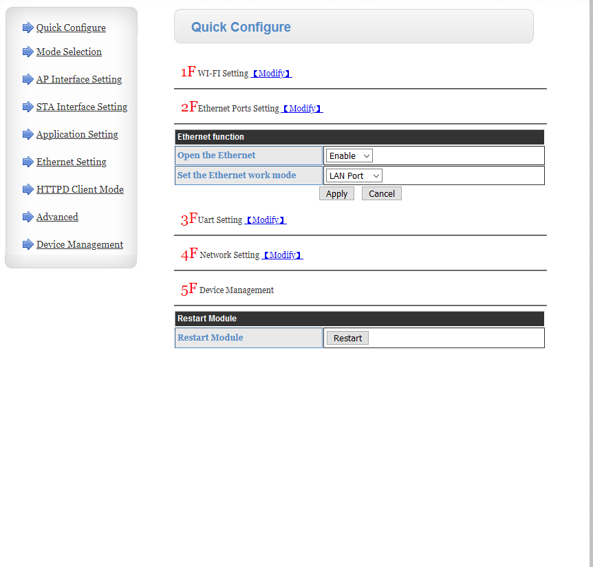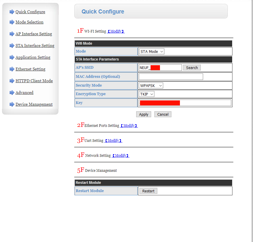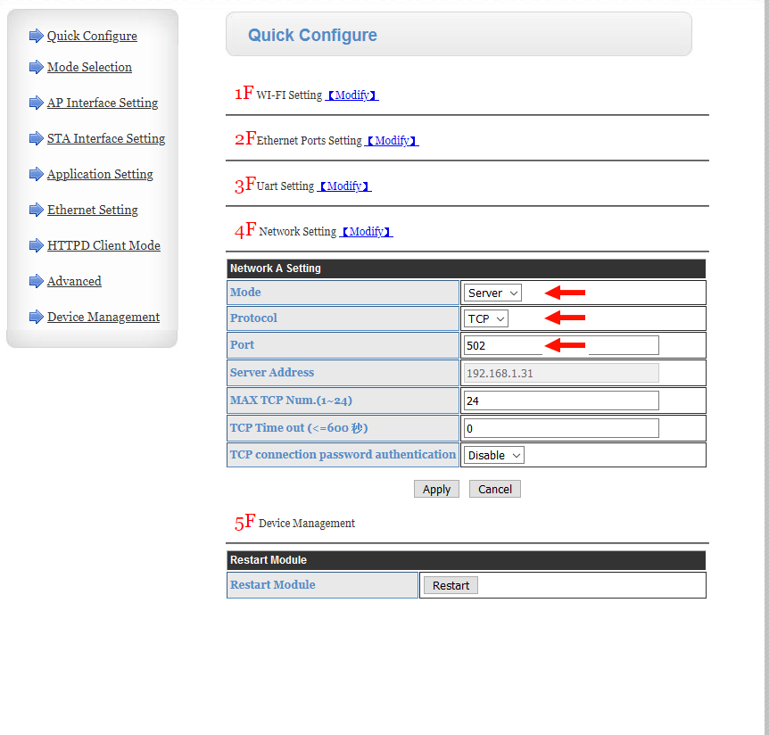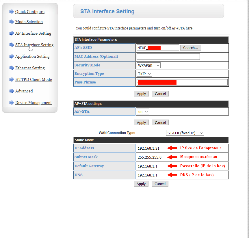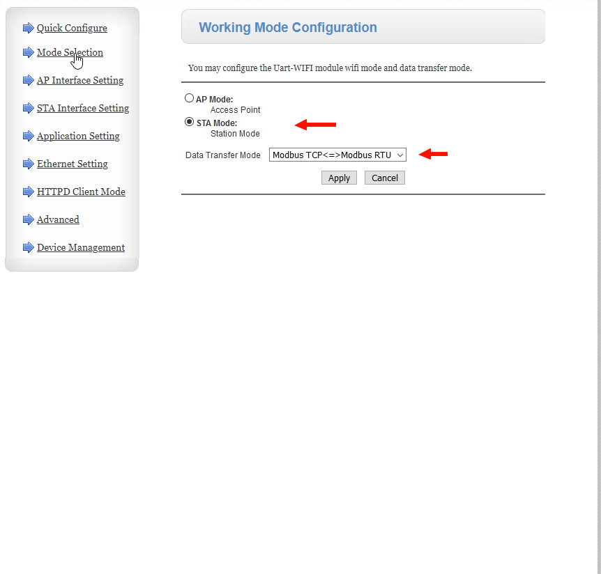 Je l’ai connecté et réglé le port com en 9600,n,8,1, le working mode en « STA » et le data transfert mode en « Modbus TCP <=> Modbus RTU »