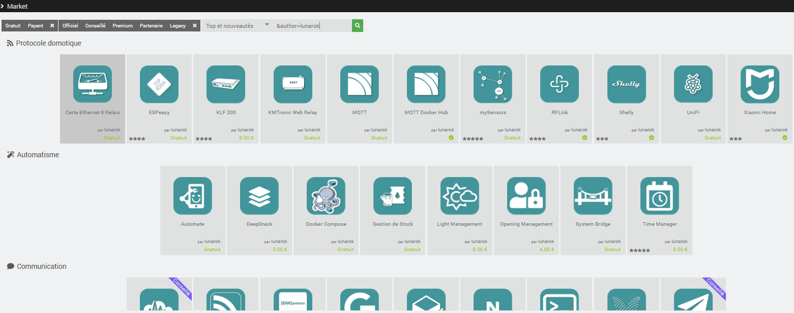 Prise de contact de Jeedom SAS auprès de Lunarok via son compte github pour lui demander de sortir les plugins non fonctionnels et non suivis (il est présent sur le github, dernières MAj de plugins en Novembre). Si pas de réponse sous 1 mois, sortie de TOUS ces plugins du market.