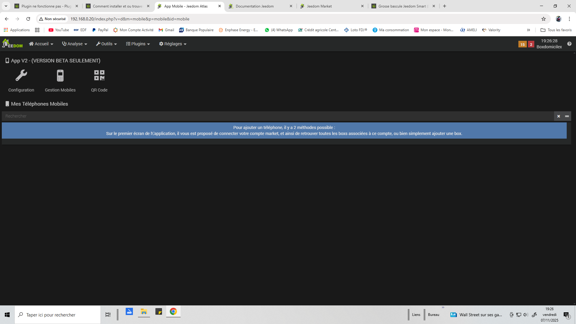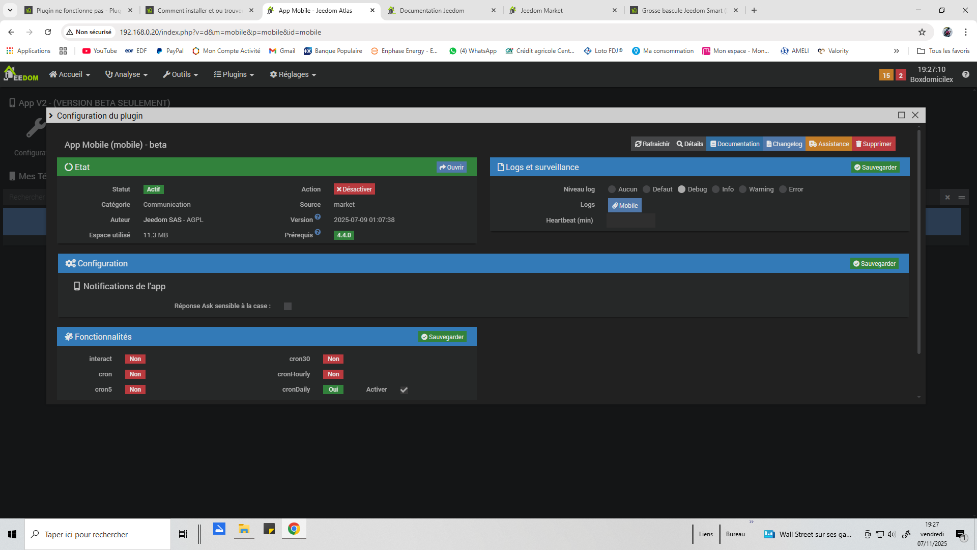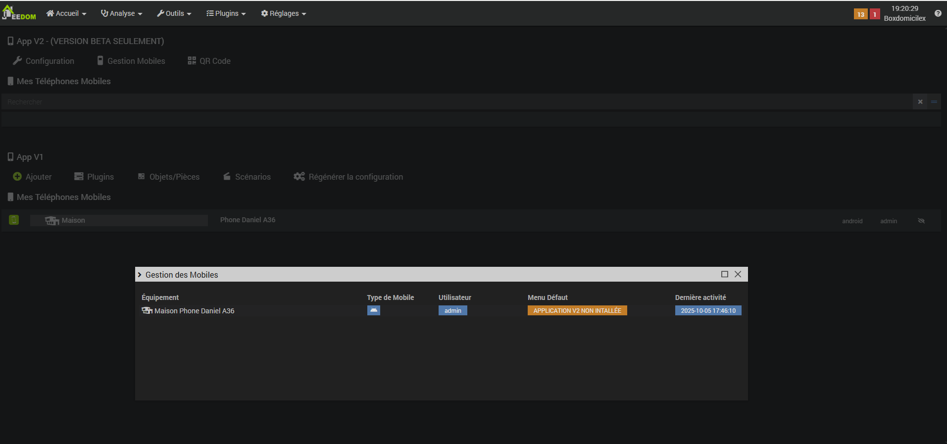 Bonjour. Je n’arrive pas à établir la communication entre l’appli jeedom V2 sur mon smartphone A36 et ma box Atlas. Tous 2 ont moins d’un mois de mise en service. La tentative de connection me renvoi une erreur d’authentification et dans gestion des mobiles, le menu défaut me dit que l’application V2 n’est pas installée. Auriez vous quelques pistes?