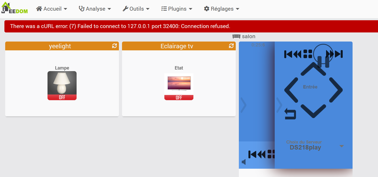 je pense avoir réussi a mettre le serveur dans le plugin,et lorsque je vais sur le dashboard le widget ne réagit a aucune commande ? je ne peux rien sélectionner mise a part le serveur, je ne vois aucune librairie juste un widget bleu avec les symbole pause play … , si je balance un film dans une fenetre firefox j’ai bien l’impression qu’il y a une remonté d’info car le temps s’écoule dans le widget , par contre lorsque je veux mettre pause ou autre il essais d’envoyer la commande sur 127.0.0.1 alors que mon serveur n’est pas sur cette IP . De plus on ne peut pas agrandir le widget pour qu’il soit plus lisible.