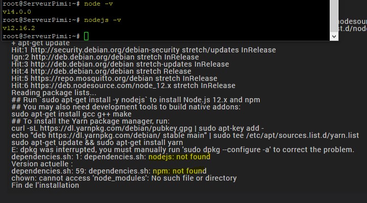 Maintenant que j’ai une version a jour : 12.16.2, et bien ça ne change rien ^^ le script des dépendances plante toujours avec le meme message d’erreur (pas de nodejs installé). J’ai oublié de vous dire que j’utilisais OMV avec Docker et qu’il tourne dessus. Théoriquement, ça ne pose pas de problème vu qu’il a les droits et l’accès au dossier VAR par défaut…