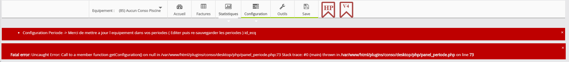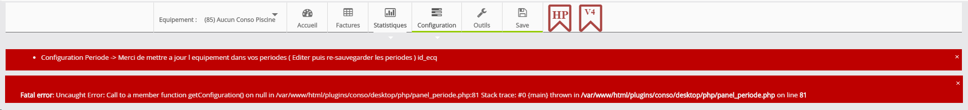 Pour info, sur un Jeedom de test sur lequel j’installe le plugin suiviconso (tout neuf tout beau), j’ai le même comportement (mise à jour de ce matin), cela ne plante plus (comm hier), je peux créer un équipement bidon, que je paramètre comme étant le père, de l’elec avec 6KVA, je met la devise à €, ensuite je vais sur le pannel de suivi, il me dit un truc à propos des périodes, je vais dans périodes, ou boum… le message d’erreur.