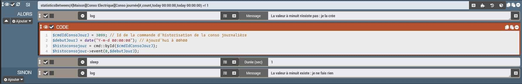 Sinon, perso pour remettre à zéro ma valeur de conso journalière à minuit pile avant que la première mesure de conso ne soit encore remontée, je procède comme ceci avec un scénario :