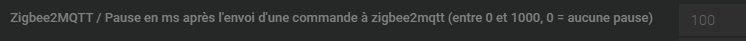 Ajout d’une option permettant d’appliquer une pause (en millisecondes) après l’envoi d’un ordre de Jeedom vers Zigbee2MQTT, afin d’éviter une surcharge de Z2M lors d’un envoi massif de commandes (ex : « Alexa, éteins toutes les lumières »).