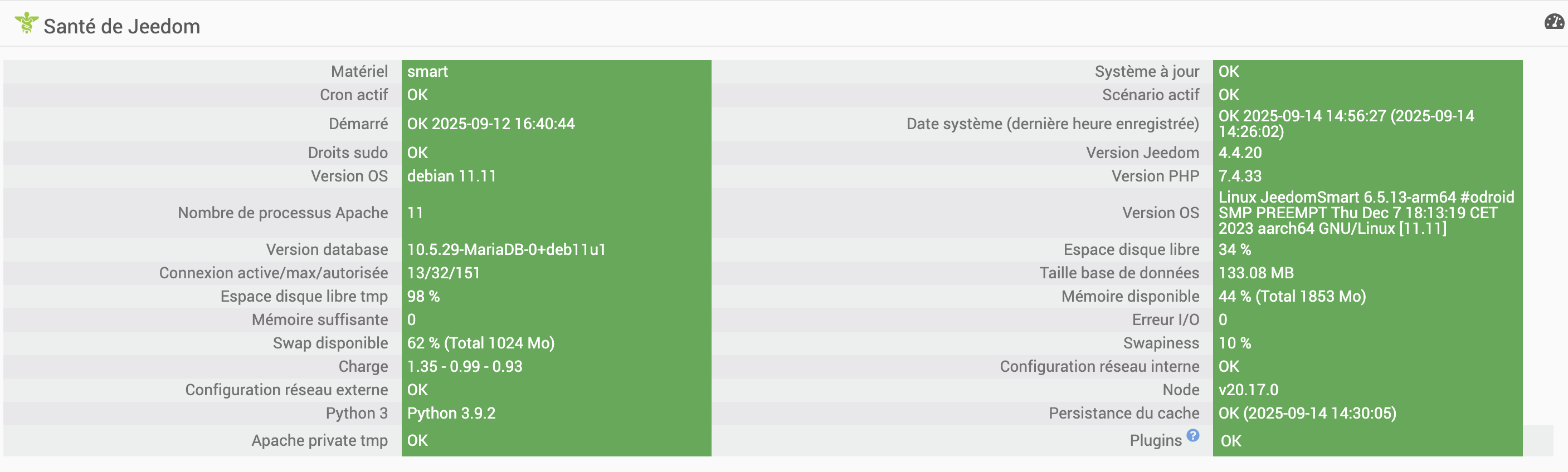 Page santé jeedom, page configuration du plugin et log.