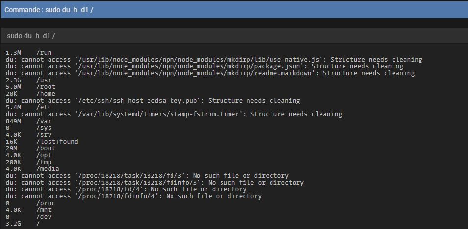 Tu peux essayer la commande suivante ? Elle peut par contre mettre un peu de temps à s’exécuter … (elle va faire la somme des répertoires à partir du répertoire racine)